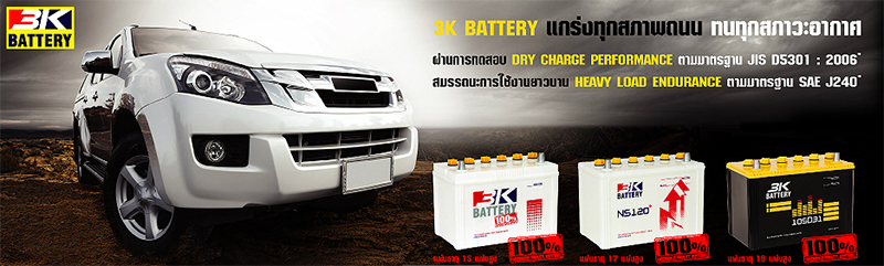 3K แบตเตอรี่ แบตเตอรี่สัญชาติไทยมาตรฐานคุณภาพสินค้าระดับสากล ทั้งยังเป็นผู้นำของ ตลาดแบตเตอรี่ในเมืองไทย ด้วยการผลิตที่เน้นคุณภาพทุกขั้นตอนและ ผ่านการทดสอบอยู่ตลอด และทำการหาข้อบกพร่องต่างๆเพื่อพัฒนาสินค้าให้มีอายุการใช้งานที่ยาวนานยิ่งขึ้น นอกจากนี้บริษัทแบตเตอรี่ 3เค ยังออกทีมช่วยเหลือ ฉุกเฉินในกรณีที่รถของท่านเกิดมีปัญหาเกี่ยวกับแบตเตอรี่ สายด่วนช่วยเหลือโทร 02-393-3333 แบตเตอรี่3K ผลิตแบตเตอรี่ราคาถูกคุณภาพดีออกมาหลายรุ่นไม่ว่าจะเป็นแบบน้ำ แบบกึงแห้ง และแบบแห้ง